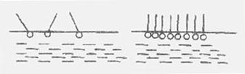 В 1-м случае вещества не влияют на поверхностное натяжение растворителя и распределяются равномерно между поверхностным слоем и объемом раствора. Поверхностно-неактивные вещества стремятся уйти с поверхности жидкости в объеме. Поверхностно-активные вещества, наоборот, стремятся накапливаться в поверхностном слое. Накопление вещества поверхностным слоем называется адсорбцией. Характерной особенностью всех поверхностно-активных веществ является их дифильность, то есть то, что они состоят из двух частей – полярной группы и неполярного углеводородного или ароматического радикала. ПАВ - это органические кислоты, спирты, эфиры, амины, кетоны, мыла и другие моющие средства. Молекулы ПАВ при внесении их в воду стремятся выйти на границу раздела вода/пар, где каждая из указанных частей молекул ориентируется соответственно своей природе: полярная группа - в сторону полярной среды (в воду), неполярная - в воздух (рис. 2).