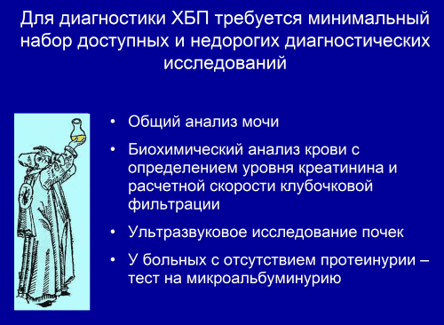Поэтому диагностика ХБП основана на лабораторных и лучевых исследованиях. Решающее значение имеет организация регулярных профилактических обследований.