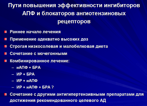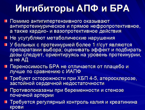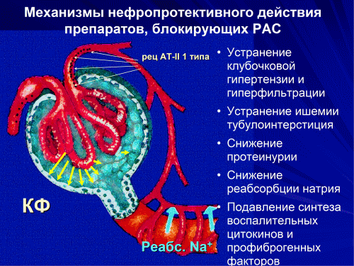 Основной задачей назначения препаратов, блокирующих РАС, является не снижение АД, а протеинурии. С антипротеинурической целью они могут применяться у пациентов с нормотонией. При хроническом гломерулонефрите показанием к назначению данных препаратов считают уровень протеинурии более 1 г/сут (хотя есть основания предполагать, что они благоприятно влияют на почечный прогноз и при более умеренной протеинурии). Назначение препаратов, блокирующих РАС, снижает исходный уровень протеинурии в среднем в 1,5-2 раза; максимальный эффект достигается не сразу, а лишь спустя 3-6 месяцев от начала терапии.