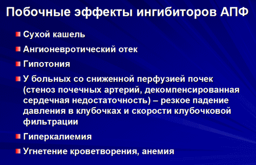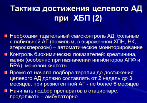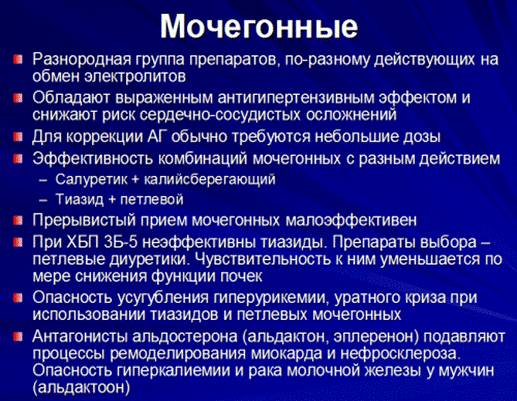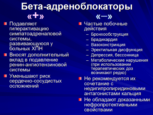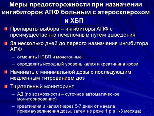 Выраженная ХБП не является противопоказанием для терапии ингибиторами АПФ и блокаторами ангиотензиновых рецепторов, которые обладают нефропротективными свойствами на любой стадии заболевания. Вместе с тем их способность отдалять наступление терминальной ХБП находится в прямой зависимости от длительности лечения. Поэтому польза от их назначения на поздних стадиях ХБП в отношении почечного прогноза существенно ниже, чем на раннем этапе, а риск побочных действий (нарастания гиперкреатининемии и калия) – существенно выше. Из этого необходимо исходить, решая в каждом индивидуальном случае вопрос о целесообразности данной терапии при поздней ХБП.