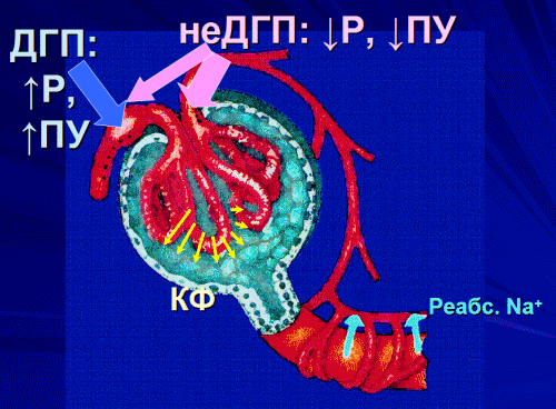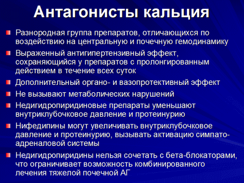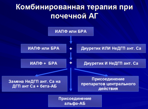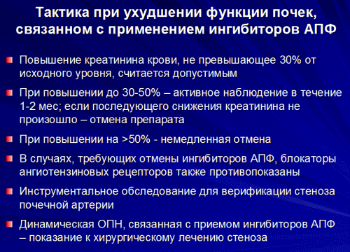 Контроль за уровнем калия и креатинина – непосредственно перед назначением препаратов, блокирующих РАС, или увеличением дозы, через 7-10 дней лечения и в дальнейшем не реже 1 раза в месяц – является непременным условием, обеспечивающим безопасность терапии. Гиперкалиемия связана со снижением секреции калия в дистальных канальцах в ответ на подавление продукции альдостерона. При ее развитии исключают из рациона продукты, богатые калием, назначают салуретики. При неэффективности может быть предпринята попытка замены ингибитора АПФ на блокатор ангиотензиновых рецепторов. Повышение креатинина отражает перестройку почечной гемодинамики на фоне лечения, устранение феномена клубочковой гипертонии. Умеренная его степень (до 30% от исходного уровня) расценивается как положительный ответ на лечение. При повышении на 30-50% уменьшают дозу препарата; если через 2 месяца не происходит уменьшения уровня креатинина, препарат отменяют. Повышение уровня креатинина более чем на 50% от исходного может свидетельствовать о резкой дестабилизации почечной гемодинамики, критическом падении клубочкового давления, что часто наблюдается при сниженной перфузии почек. Данная ситуация служит показанием для немедленной отмены препарата и применения лучевых методов диагностики (УЗДГ, МРТ-ангиографии) с целью исключения стеноза почечной артерии. Без дополнительной антигипертензивной терапии в большинстве случаев не удается достичь целевого АД. У больных с протеинурическими формами ХГН и сахарным диабетом препаратами выбора являются недигидропиридиновые антагонисты кальция, которые, в отличие от дигидропиридинов, не повышают клубочковое давление и не усиливают протеинурию.