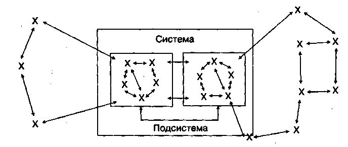 Таким образом, любая организация состоит из подсистем, каждая из которых может рассматриваться как система более низкого уровня. В то же время сама организация, имея некоторое количество уровней подсистем, в свою очередь может рассматриваться как подсистема в системе более высокого порядка (например, предприятие, выступая как самостоятельная система, делится на ряд цехов-подсистем и одновременно как подсистема входит в производственное объединение). Свойство объекта быть одновременно и подсистемой, и сложной системой с наличием элементов подсистем определяется как свойство рекурсивности.