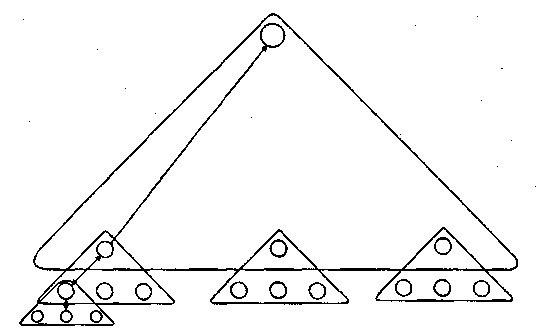 Формирование и функционирование групп в организациях, а также поведение их членов имеет большое значение для управления организацией, так как они создают (или не создают) внутреннюю поддержку рабочих организационных норм. Американский социолог Р. Лайкерт, например, развивает концепцию организации, основанную на влиянии рабочих групп на ее деятельность. В его теоретических построениях прослеживается связь между процессами в группах и действием власти, технологией, культурой, официальной структурой и другими компонентами организации. По мнению Лайкерта, «групповые действия важны не только для изучения влияния поведения индивидов в повседневной деятельности, производительности труда в организации, трудовой дисциплины, но и для изучения поведения организации в целом» [145. Р. 18]. Согласно его концепции, члены организации и ее подразделений (отделов, цехов, лабораторий и др.) выполняют свои функции значительно более эффективно, если они участвуют в деятельности сразу нескольких групп, соединяя свои усилия. Одновременное членство работников в различных группах организации осуществляется с помощью «связующей иглы», или связующего звена, — члена организации, который может одновременно входить в разные группы. Чаще всего в этой роли выступает руководитель группы, являясь связующим звеном между своей группой и более высоким уровнем управления. На рис. 35 представлена схема вертикального одновременного членства руководителей различных уровней в организации.