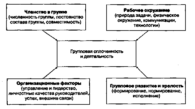 Факторы, влияющие на сплоченность группы в организации. Чтобы добиться повышения эффективности деятельности групп в организации, ее руководители должны учитывать многие факторы. Например, чтобы исключить чувство фрустрации у членов социальных групп, им следует учитывать потребности отдельных индивидов, обеспечивать поддержание высокого уровня идентификации в группе и групповую сплоченность. На уровень групповой сплоченности достаточно большое влияние оказывает большое количество факторов. Наиболее значимые из них показаны на рис. 39.