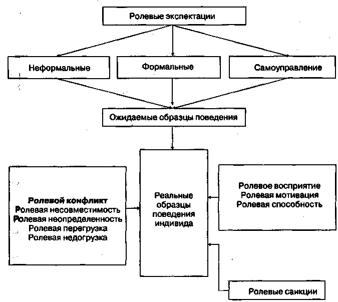 Формальные взаимодействия в организации (линейные и функциональные, горизонтальные и вертикальные и т.д.) могут рассматриваться как формы ролевых взаимодействий. Роли, которые работники исполняют в организации, являются результатом действия ситуационных факторов, таких, как требования к выполнению поставленных задач, достижению целей, к стилю управления (или лидерства), позиция в коммуникационных сетях, жесткость внешнего контроля, изменение культурных норм и ценностей и т.д.; личностных факторов — ценностей и установок, потребностей и мотивации, способностей и личностных качеств.