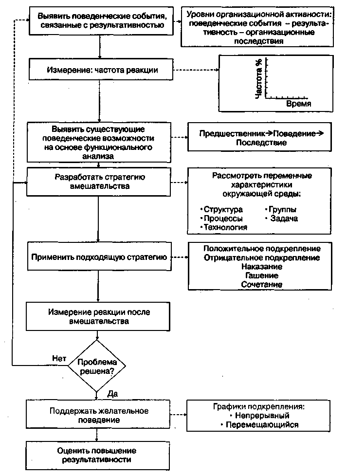 Для практического использования теории и методов подкрепления при управлении поведением членов организации необходимо разработать подробную программу, в которой предусмотрено пошаговое применение подкреплений с учетом складывающихся ситуаций. Операциональный вид теории подкрепления предложили американские исследователи организации Ф. Латенс и Р. Крейтнер, назвав эту технологию ситуационным управлением поведением. Сущность этого процесса управления можно понять из рис. 61 [88. С. 359].