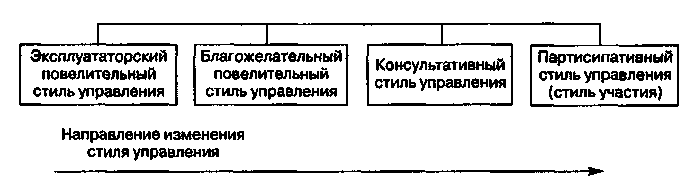 Но управление по теории Z не означает только доверие и близость руководителя к подчиненным; предполагается гибкий подход к управлению коллективами организации, например, в таких ситуациях, когда надо добиться участия членов организации в управлении, если они не в состоянии понять существо проблемы, или добиться понимания подчиненными действий руководителя, если у него нет времени для принятия решения. Ясно, что даже при самом высоком уровне культуры подчиненных он не всегда в состоянии участвовать в решении управленческих проблем. В связи с этим более перспективным кажется управленческий подход, использующий основные управленческие стили, разработанные Р. Лайкертом (рис. 64) [145. Р. 85].