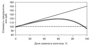 Рис. 5. Влияние финансового левериджа на стоимость предприятия: стоимость при отсутствии заемного капитала (пунктирная линия); стоимость по модели Модильяни — Миллера (сплошная линия); фактическая стоимость (двойная линия)