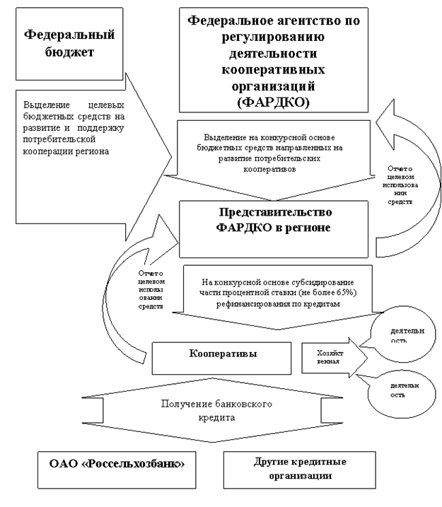 Представленная на рисунке 1 разработанная нами модель антикризисного управления финансовым обеспечением деятельности потребительской кооперации Республики Татарстан включает в себя основное звено управления в лице представительства Федерального агентства по регулированию деятельности кооперативных организаций (ФАРДКО), в функции которого входят, прежде всего, выделение и контроль за целевым использованием выделенных на конкурсной основе бюджетных средств, предназначенных для поддержки и активизации деятельности системы кооперативного движения в регионе. Кроме того, представительство ФАРДКО осуществляет на конкурсной основе субсидирование части процентной ставки рефинансирования (не более 65%) по кредитам, полученным кооперативами на развитие основной деятельности. В механизме кредитования кооперативных организаций задействованы ведущие специализированные кредитные организации, такие как ОАО «Россельхозбанк» и другие. При этом в основные функции ФАРДКО входят организация и контроль систематичности и достоверности предоставляемой отчетности кооперативных организаций о целевом использовании выделенных бюджетных средств и эффективности их использования.