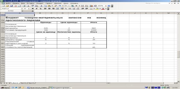Бюджет товарно-материальных запасов отражает планируемые запасы сырья, материалов и готовой продукции. Целью построения бюджета является расчет переменной стоимости изготовления единицы готовой продукции.