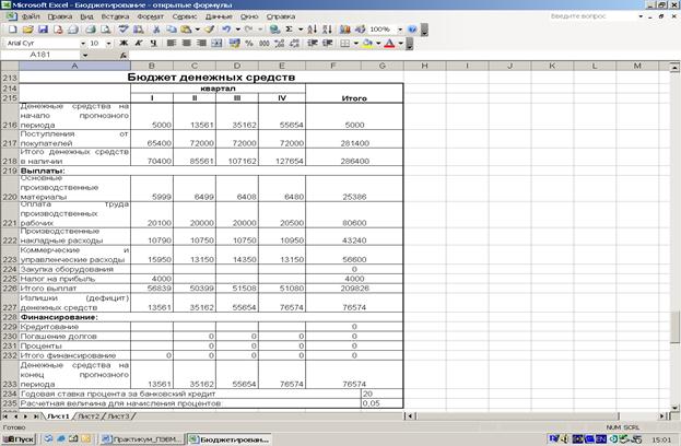Бюджет денежных средств – это плановый документ, отражающий будущие денежные поступления и платежи. В данном бюджете оценивается величина денежных средств, имеющихся в наличии у предприятия, с учетом возможных поступлений от реализации готовой продукции и величиной выплат по всем операциям. Прогнозное сальдо на конец периода сравнивается с минимальной суммой денежных средств, которая должна постоянно поддерживаться в наличии. Разность представляет собой либо неизрасходованный излишек, либо недостаток денежных средств.