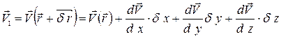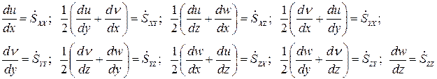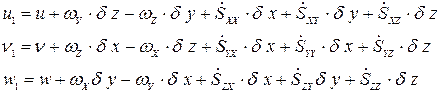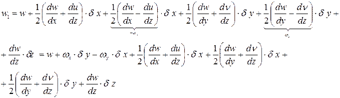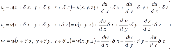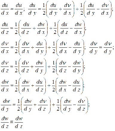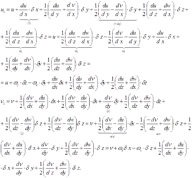 (2), то мы видим, что первые три слагаемых в правых частях, описывающих движение недеформируемого объёма совпадают, а оставшиеся слагаемые описывают деформационную составляющую движения сплошной среды.