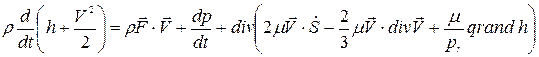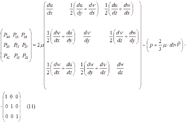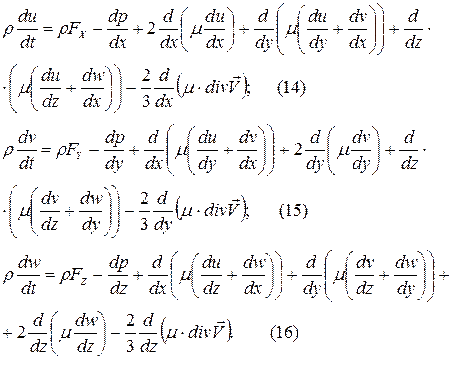 Проведя все операции преобразования как для уравнений Стокса (несжимаемой изотермической жидкости) получим уравнения Навье – Стокса для сжимаемого неизотермического вязкого газа. В проекциях на оси координат получим: