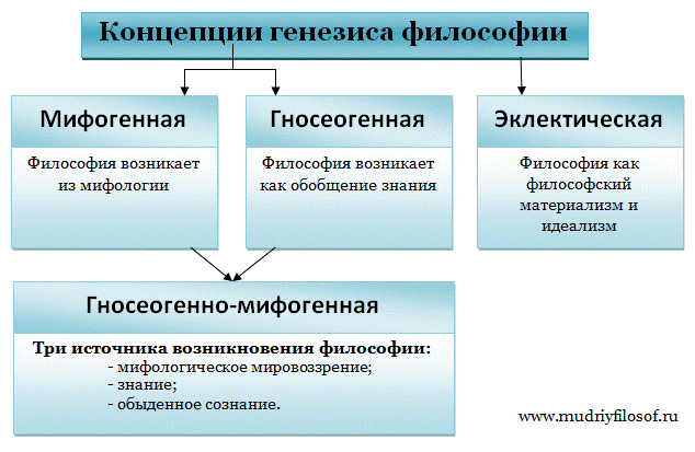 Гносеогенно-мифогенная концепция. Эта концепция стремится учесть и роль мифологического мировоззрения, и роль знания и связанного с ним мышления. Таким образом, гносеогенно-мифогенная концепция генезиса философии признает два и даже три источника возникновения философии - мифологическое мировоззрение, знание и само обыденное сознание, ходячую нравственность, которая может быть непосредственным источником философии.