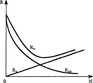 Помимо прямого риска Rпp, создаваемого данным оборудованием (на уменьшение которого направлены мероприятия по обеспечению безопасности), существует еще и косвенный риск Rк,. Он обусловлен созданием предохранительных устройств, средств защиты, их эксплуатацией и т.п. С ростом расходов N на обеспечение безопасности прямой риск уменьшается, а косвенный риск растет (рис. 1).