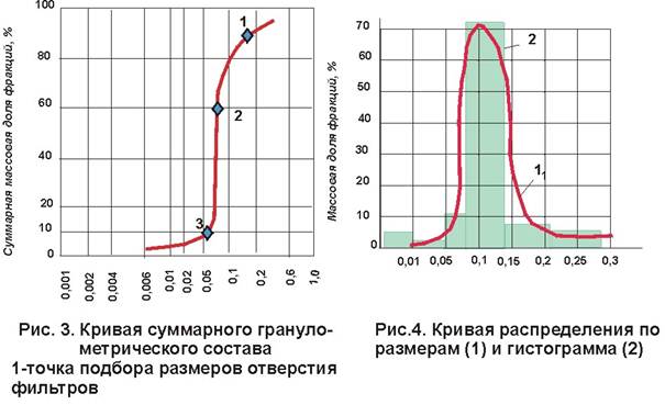 , где d60 - диаметр частиц, при котором суммарная массовая доля фракций с диаметрами, начиная от нуля и кончая данным, составляет 60% всей массы фракций (точка 2 на рис. 3), а d10 - аналогичная величина для точки кривой суммарного гранулометрического состава (точка 3 на рис. 3). По диаметру, соответствующему точке 1, подбирают размеры отверстий забойных фильтров для нефтяных скважин.