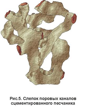 На рис 5 показан слепок поровых каналов. Конфигурация пор довольно сложная – каналы по которым течет жидкость сильно различаются по размерам и форме и соединяются между собой самым беспорядочным образом. Точно определить размеры всех каналов невозможно, так же и их соотношения между собой.