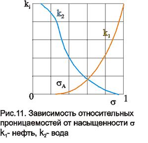 Характерная несимметричная форма кривых относительной проницаемости объясняется тем, что при одной и той же насыщенности более смачивающая фаза занимает преимущественно мелкие поры и относительная проницаемость у неё меньше. При малых насыщенностях часть каждой из фаз находится в несвязном состоянии в виде изолированных мелких капель или целиков и не участвует в движении. Поэтому, начиная с некоторой насыщенности, каждая фаза полностью переходит в несвязное состояние и её относительная проницаемость становится равной нулю, т.е. k1(s)=0 при s<sA, k2(s)=0 при s>1-sA. Движение этой фазы может происходить только, если s > sА. Для второй фазы связанная компонента равна 1- sA. Заметим, что хотя речь идет о совместной фильтрации двух несмешивающих жидкостей, приходится различать вытесняющую и вытесняемые фазы, т.к. относительные проницаемости различны в зависимости от того, какая из фаз (более или менее смачиваемая) первоначально заполняла пористую среду, т.е. существует гистерезис относительных проницаемостей.