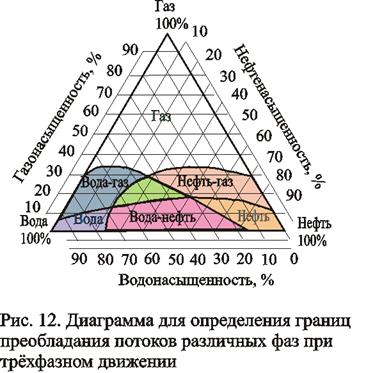 На треугольной диаграмме показаны границы преобладания фаз. Из диаграммы видно, что при газонасыщенности более 35 % поток состоит только из газа, зелёная область показывает на наличие всех фаз. По диаграмме можно определить, какие компоненты движутся в пласте при данном соотношении величин насыщенности пор фазами.