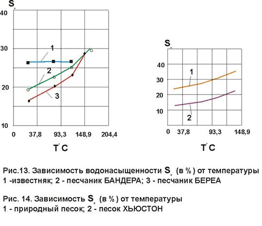 1. С ростом температуры увеличивается водонасыщенность пористой среды и уменьшается остаточная нефтенасыщенность (рис. 13).