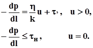 Нижняя граница. При очень малых скоростях с ростом градиента давления увеличение скорости фильтрации происходит более быстро, чем по закону Дарси. Данное явление объясняется тем, что при малых скоростях становится существенным силовое взаимодействие между твердым скелетом и жидкостью за счет образования аномальных, неньютоновских систем, н.п. устойчивые коллойдные растворы в виде студнеобразных плёнок, перекрывающих поры и разрушающихся при некотором градиенте давления tн, называемого начальным и зависящим от доли глинистого материала и величины остаточной водонасыщенности. Имеется много реологических моделей неньютоновских жидкостей, наиболее простой их них является модель с предельным градиентом