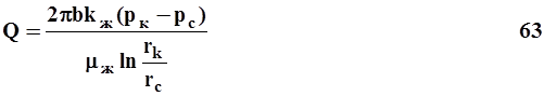 Дебит газированной жидкости можно определить, заменив газированную жидкость воображаемой однородной несжимаемой жидкостью, движущейся в пласте с коэффициентом проницаемости kж, меньшим k и равной фазовой