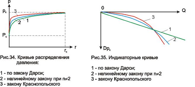 При фильтрации по нелинейному закону фильтрации индикаторная линия не может быть прямой (рис.35).