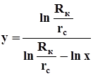 Определим дебит в двух крайних случаях: по закону Дарси и по закону Краснопольского развитого нелинейного течения. Тоже самое сделаем и в случае радиально-сферического течения. Если примем радиус одной скважины rс, а другой - rc/= xrc и, соответственно, дебиты G и G/, а их отношение обозначим через у=G/G/, то получим следующие формулы для вычисления предельных значений у