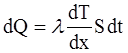 Коэффициент теплопроводности (удельного теплового сопротивления) l характеризует количество теплоты dQ, переносимой в породе через единицу площади S в единицу времени t при градиенте температуры dT/dx: