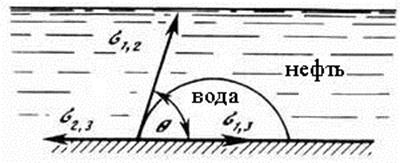 Краевой угол Q измеряется в сторону более полярной фазы (в данном случае в сторону воды). Принято условно обозначать цифрой 1 водную фазу, цифрой 2 – углеводородную жидкость или газ, цифрой 3 – твёрдое тело.