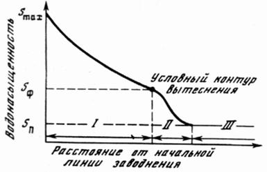 Водонасыщенность пласта уменьшается от максимального значения Smax, соответствующего конечной нефтеотдаче на начальной линии нагнетания воды, до значения насыщенности погребённой воды Sп. При этом в пласте можно отметить три зоны. В первой из них, где водонасыщенность изменяется от Smax до Sф, на условном контуре вытеснения она плавно понижается по направлению к нефтенасыщенной части пласта. Этот участок характеризует зону водонефтяной смеси, в которой постепенно вымывается нефть.