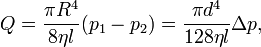 При установившемся ламинарном движении вязкой несжимаемой жидкости сквозь цилиндрическую трубу круглого сечения секундный объёмный расход прямо пропорционален перепаду давления на единицу длины трубы и четвертой степени радиуса и обратно пропорционален коэффициенту вязкости жидкости.