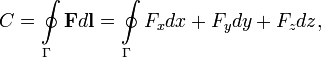 вдоль контура. Окружность на символе интеграла подчёркивает тот факт, что интегрирование производится по замкнутому контуру. Приведенное выше определение справедливо для трёхмерного случая, но оно, как и основные свойства, перечисленные ниже, прямо обобщается на произвольную размерность пространства.