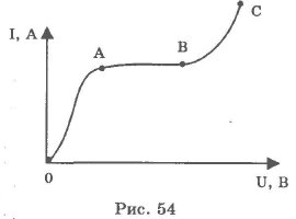 Носителями электрического тока при несамостоятельном разряде являются положительные ионы и отрицательные электроны. Вольт-амперная характеристика представлена на рис. 54. В области ОАВ - несамостоятельный разряд. В области ВС разряд становится самостоятельным.