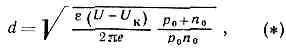 где е — заряд эл-на, e — диэлектрич. проницаемость, U/к — контактная разность потенциалов, U — внеш.напряжение, n0 — концентрация эл-нов проводимости в n-области, р0 — концентрация дырок в р-области.Напр., для р — n-перехода в Si, где Uк=1В при n0=p0»1015, d=2 мкм. Для контакта металл — электронныйПП или металл — дырочный ПП d определяется по ф-ле (*), в к-рой положено p0<-n0 или p0->N0.