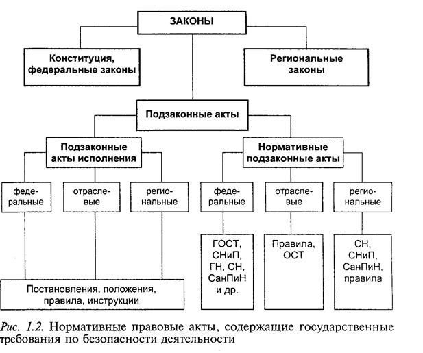 При этом документация Минздрава включает в себя гигиенические нормативы (ГН), санитарные нормы (СН), санитарные правила (СП), санитарные нормы и правила (СанПиН); Госстандарт включает Государственные стандарты (ГОСТ); Госстрой — строительные нормы и правила (СНиП). На уровне отраслей — это ОСТы, Правила и т. д. Законы и подзаконные акты, вместе взятые, объединяются понятием нормативных правовых актов, структура которых представлена на рис. 2.2.