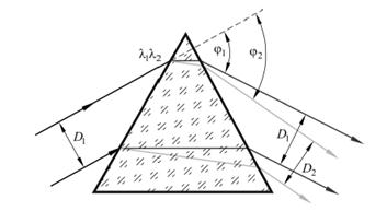 Диспергирующая система предназначена для пространственного разделения пучков света различных длин волн. В качестве диспергирующих элементов используются призмы, дифракционные решетки, а также интерферометр Фабри-Перо и другие приборы. Рассмотрим ход лучей в призменном спектральном приборе (рис.2). Пусть источник 1 излучает свет только двух длин волн