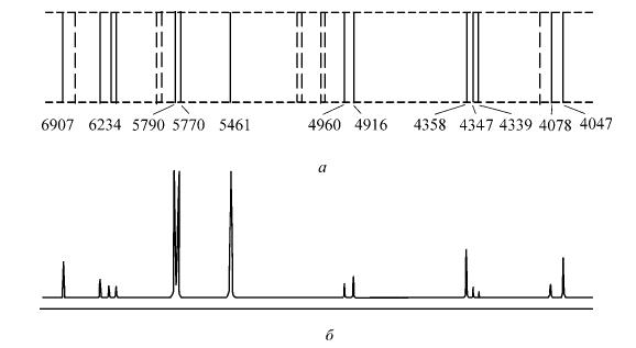 Рис. 4. Система спектральных линий излучения ртути (а) и соответствующее распределение интенсивности света в спектре (б)