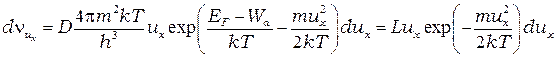 , применяя разложение логарифма в ряд, как это делалось при выводе формулы (П-8), используя (П-11), (П-12), а, также учитывая отражение от барьера, получим формулу для числа электронов, прошедших потенциальный барьер, и имеющих после этого скорость в диапазоне от
