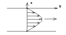 Внутренним трением или вязкостью называют вид тре- ния между слоями жидкости или газа. Примером вязкого трения является трение слоев воды в реке или ручье. Вблизи берега скорость воды близка к нулю, тогда как к центру реки скорость воды возрастает. Распределение скорости слоев жидкости имеет вид, представленный на рис.1.7.