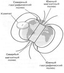 Магниты. История магнетизма уходит своими корнями к античной цивилизации Малой Азии. Именно там, в Магне- зии, находили горную породу, кусочки которой притягивали друг друга. По названию территории такие вещества и стали называть магнитами. Задолго до открытия магнитного поля были созданы компасы, которыми для целей навигации стали пользоваться китайские мореплаватели еще в XI в. Компас представляет собой магнит с одной точкой опоры. Один ко- нец стрелки показывает на южный магнитный полюс, распо- ложенный на севере, а другой на северный, распложенный в южном полушарии. Причем магнитные и географические полюса не совпадают.