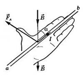 Правило левой руки звучит так: если пальцы левой руки расположить вдоль направления тока, а силовые линии маг- нитной индукции будут входить в ее ладонь, то большой па- лец будет указывать направление действующей силы.
