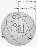 По мнению Резерфорда, такое могло наблюдаться только в случае, если положительно заряженные α-частицы сталки- ваются с массивным ядром, имеющим маленькие размеры по сравнению с размерами атома. Скорее всего, атом напомина- ет Солнечную систему, где вместо Солнца располагается яд-