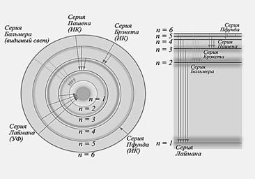 Рис. 4.7. Объяснение серий линий Лаймана, Бальмера, Пашена и др. на основе модели Бора.