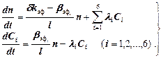 Для решения этого уравнения, содержащего семь переменных (п, C 1, С 2,..., С 6), нужно знать законы изменения концентраций ядер-предшественников запаздывающих нейтронов каждой группы. В символической форме искомая зависимость для некоторой 1-й группы может быть записана в виде