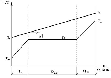 Ломаная линия характеризует изменение температуры среды второго контура (вода - пар). На рисунке приняты обозначения: T п.в - температура питательной воды на входе в парогенератор; T п.е. - температура перегретого пара на выходе из парогенератора; q эк, q исп, q пе, - мощности поверхности нагрева экономайзерной, испарительной и пароперегревательной частей парогенератора.