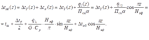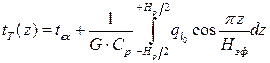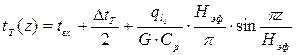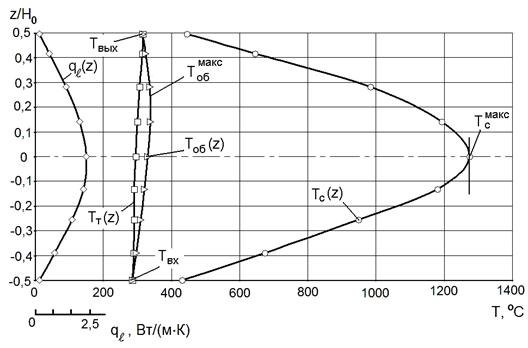 Рис. 8.6. Распределение температур теплоносителя, оболочки ТВЭЛа и топливного сердечника по высоте канала для реакторов типа ВВЭР, при косинусоидальном распределении теплового потока q1(z)