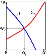 Рис. 8.7. Гидравлические характеристики насоса (1) и контура (2)