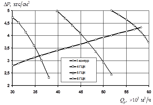 Рис. 8.8. Гидравлические характеристики ГЦН и 1-го контура ВВЭР-440 при различном числе работающих ГЦН (ΔP– средний перепад давления на ГЦН и сумма потерь давления на элементах 1-го контура, кгс/см2; Qр–расход теплоносителя через реактор, м3/ч)
