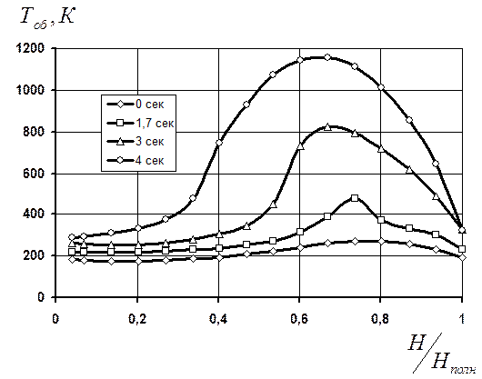 Рис. 8.9. Распределение температуры по высоте оболочки ТВЭЛа в кассете максимальной нагрузки при обесточивании насосов в различные